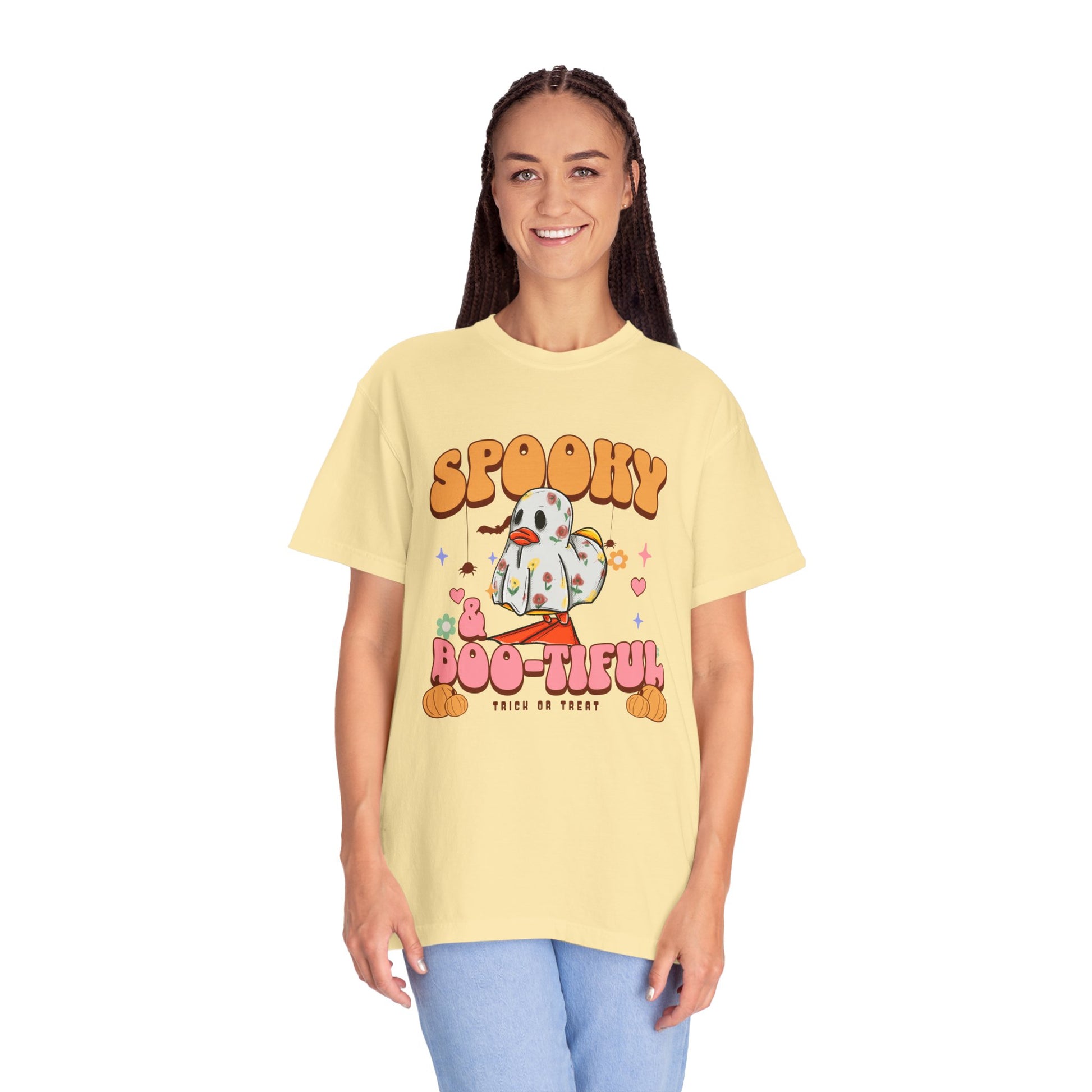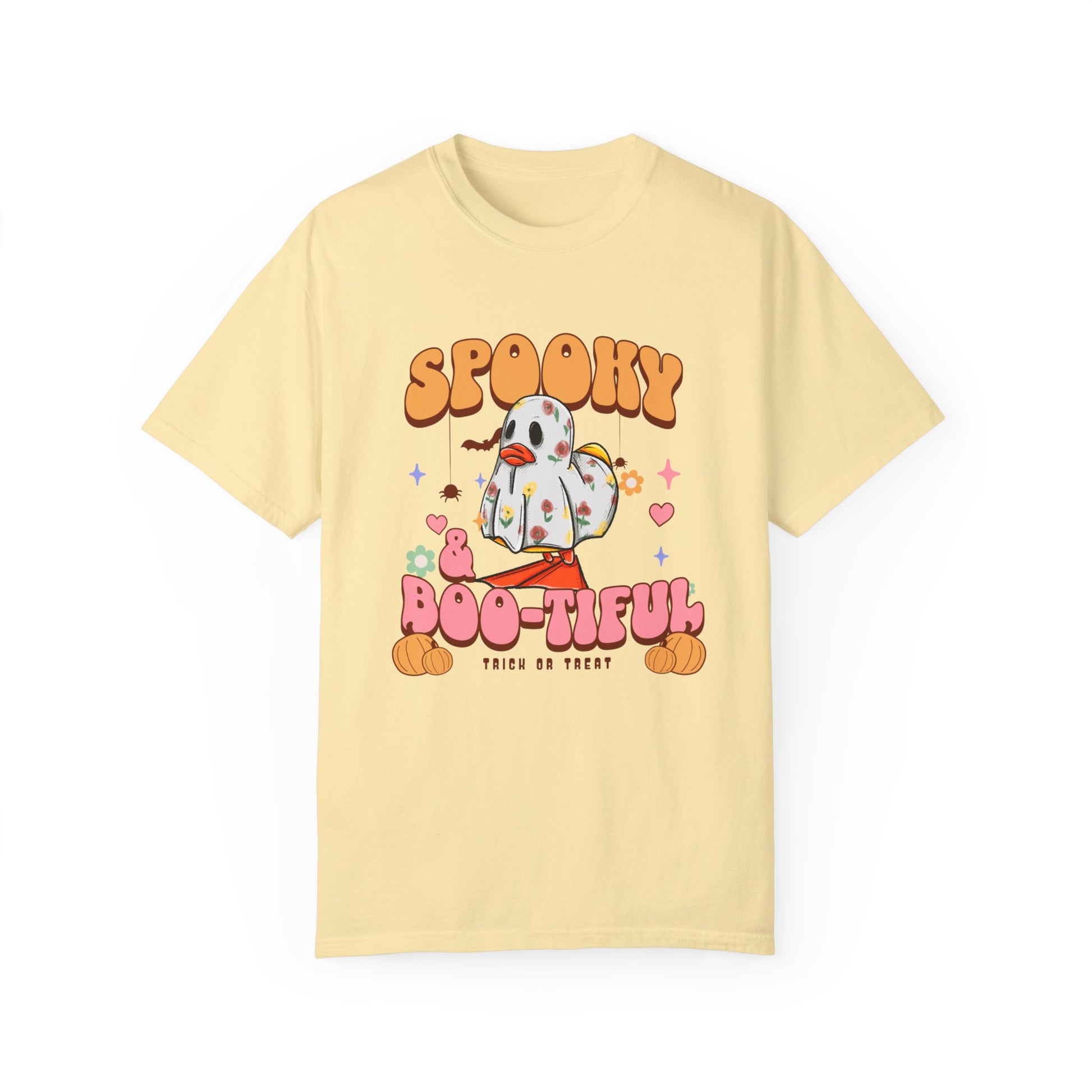 This "Spooky & Boo-tiful" t-shirt is perfect for celebrating Halloween in style! Featuring an adorable rubber duck dressed up as a ghost, this design brings together the cute and spooky vibes of the season. With playful fonts and Halloween-themed elements like pumpkins and bats, this shirt is ideal for trick-or-treating, Halloween parties, or simply embracing the festive spirit. The soft, comfortable fabric makes it great for all-day wear, ensuring you stay cozy while looking "boo-tiful." Whether you're a fan of rubber ducks or just love fun, quirky Halloween designs, this shirt is a must-have addition to your wardrobe!