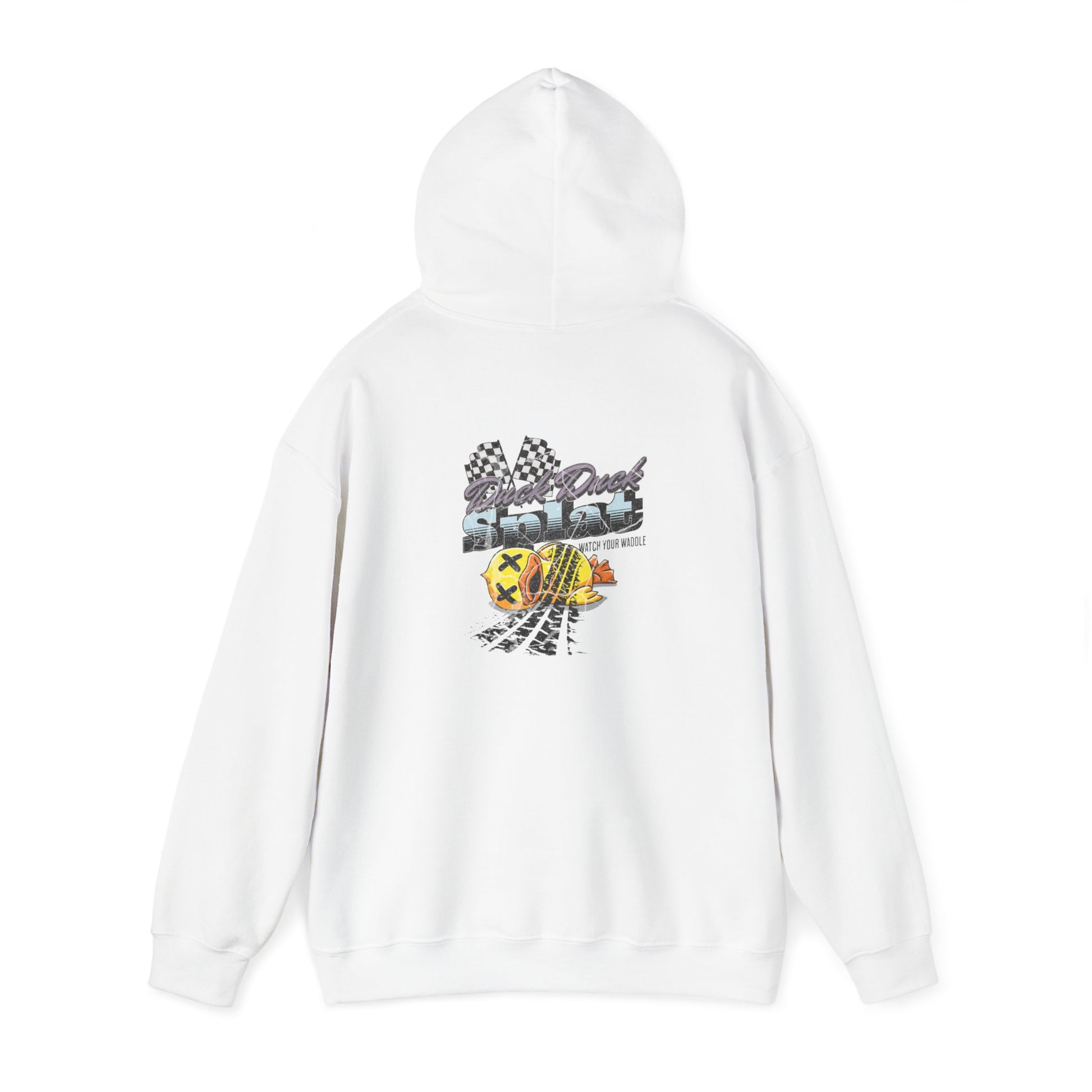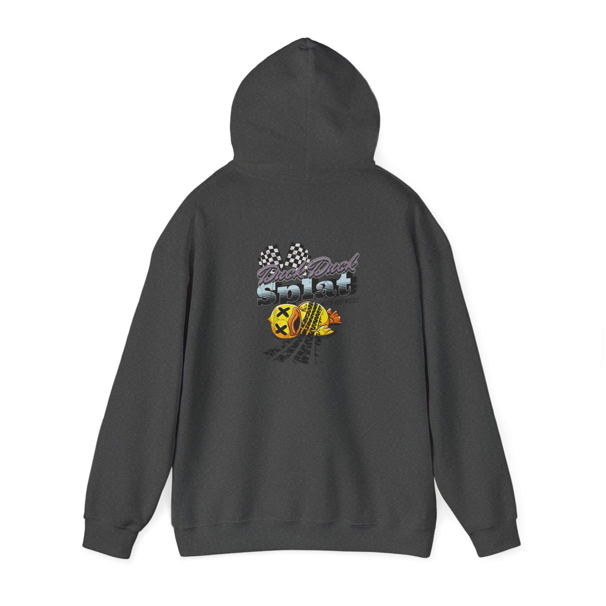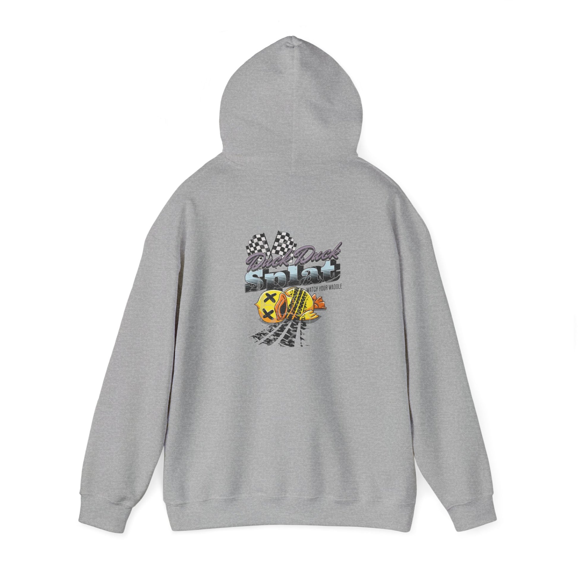 Stay cozy and make a statement with the Duck Duck Splat Hoodie—where playful meets edgy. This hoodie features a vibrant and bold graphic of a rubber duck that’s met its match, complete with tire tracks and checkered flags for that high-octane twist. The eye-catching design, paired with the cheeky "Duck Duck Splat" text, adds a fun and rebellious vibe to your everyday look..