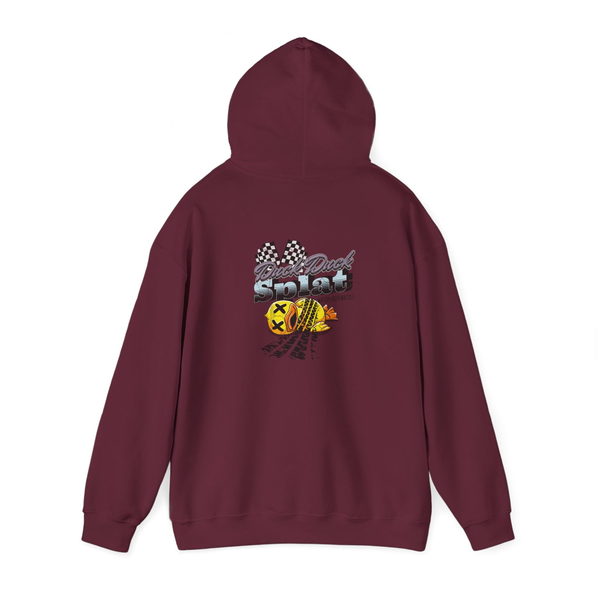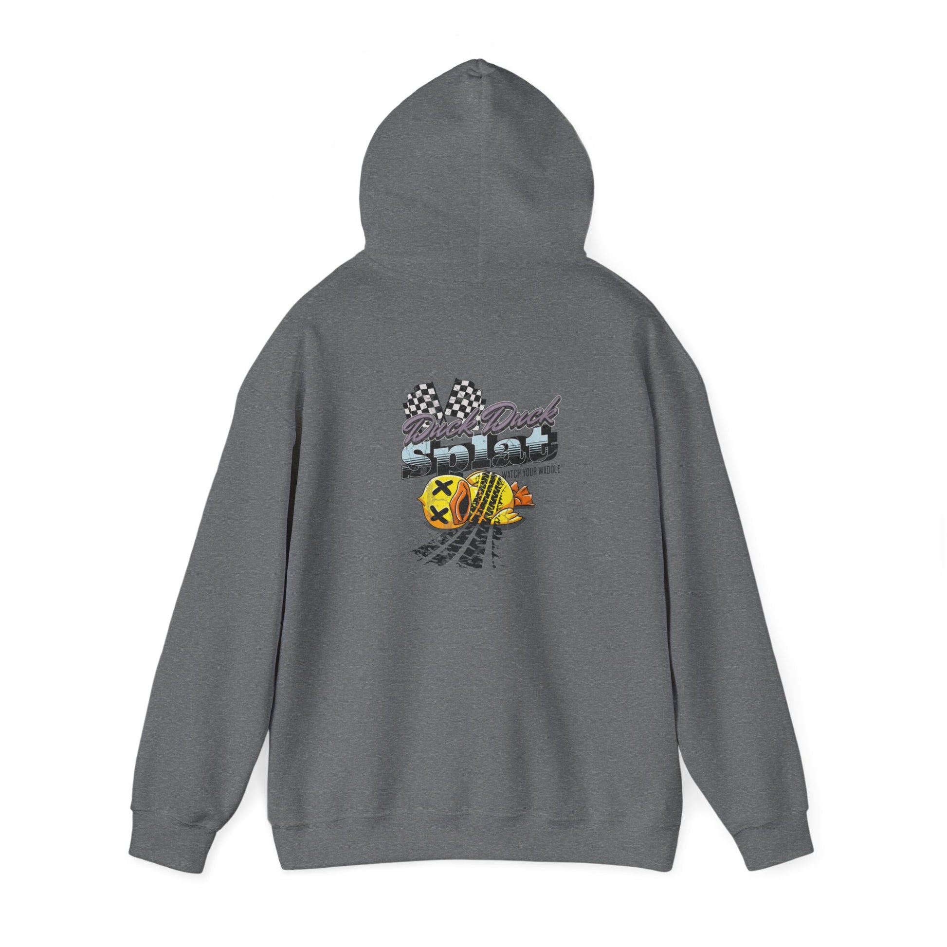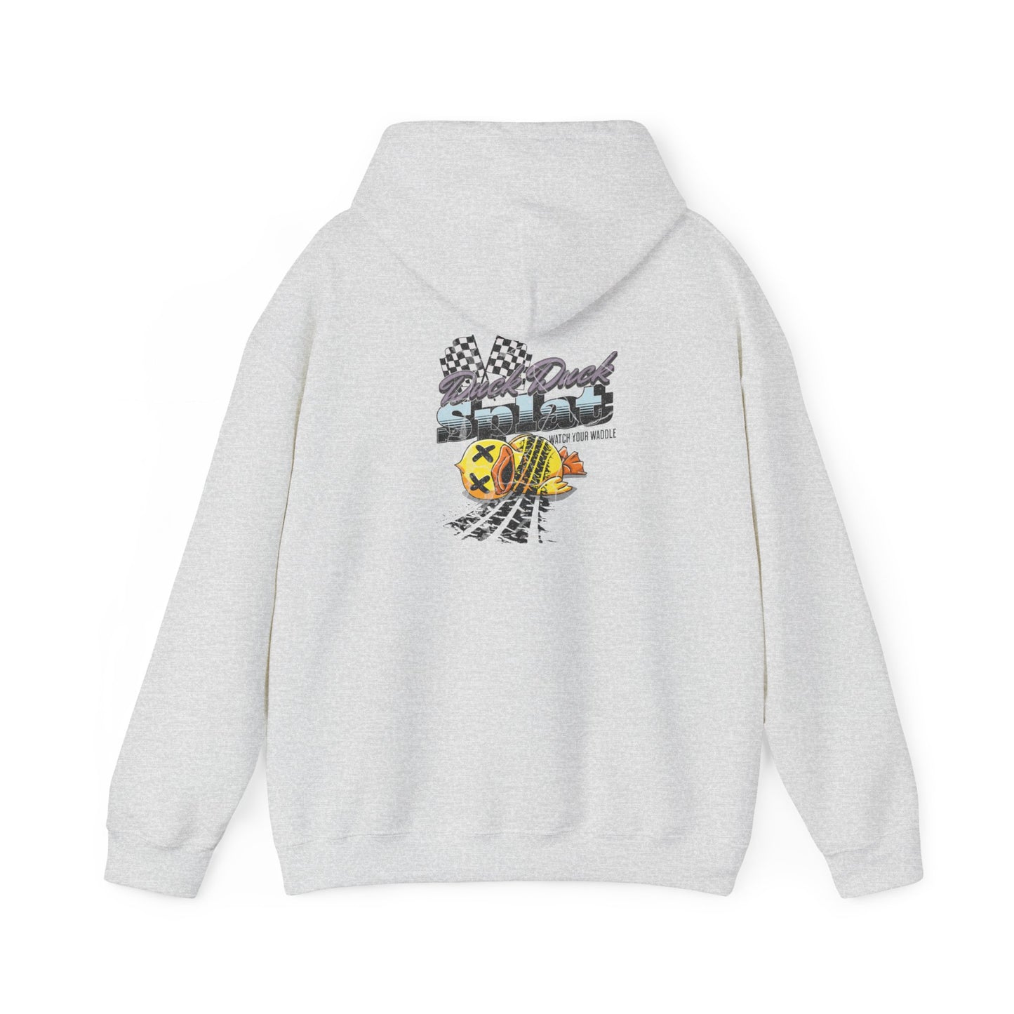 Stay cozy and make a statement with the Duck Duck Splat Hoodie—where playful meets edgy. This hoodie features a vibrant and bold graphic of a rubber duck that’s met its match, complete with tire tracks and checkered flags for that high-octane twist. The eye-catching design, paired with the cheeky "Duck Duck Splat" text, adds a fun and rebellious vibe to your everyday look..