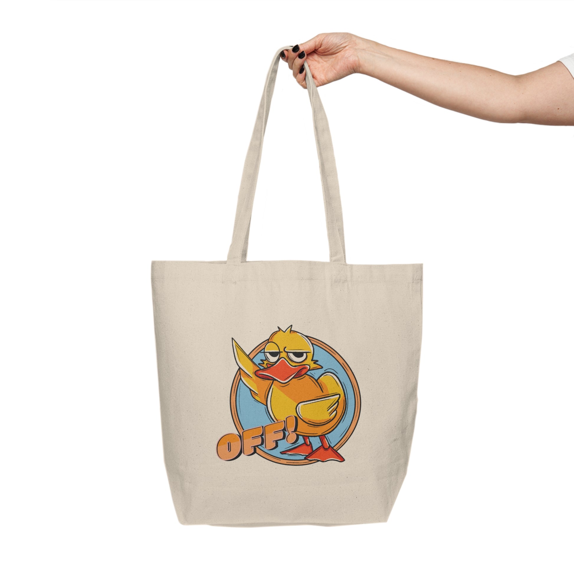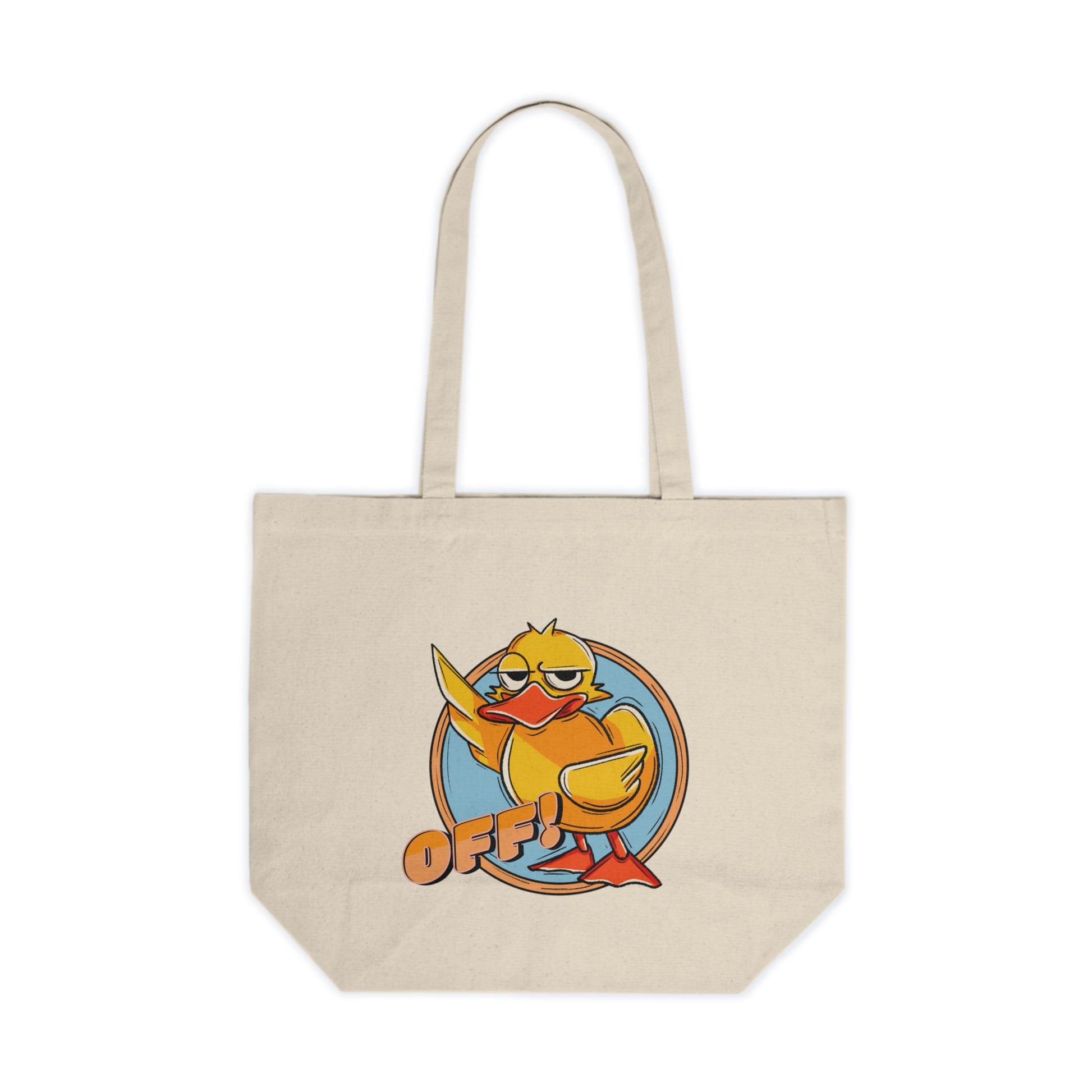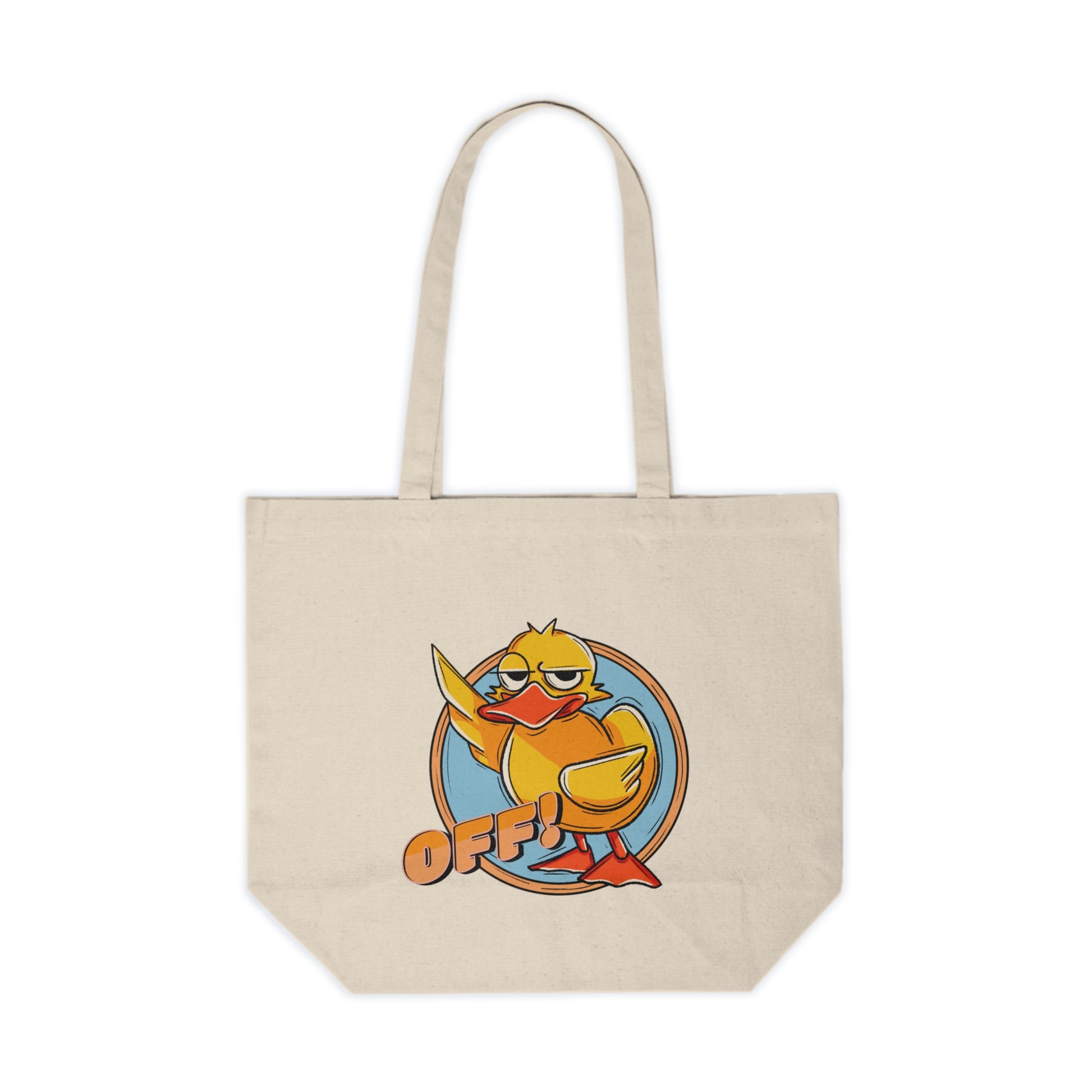 Carry your essentials with attitude using our "Duck Off!" canvas tote! Featuring a sassy rubber duck flipping the wing and the bold "OFF!" text, this tote bag is perfect for those who like to make a statement wherever they go. Whether you're heading to the store, the gym, or just out and about, this tote adds a fun and cheeky twist to your daily routine.