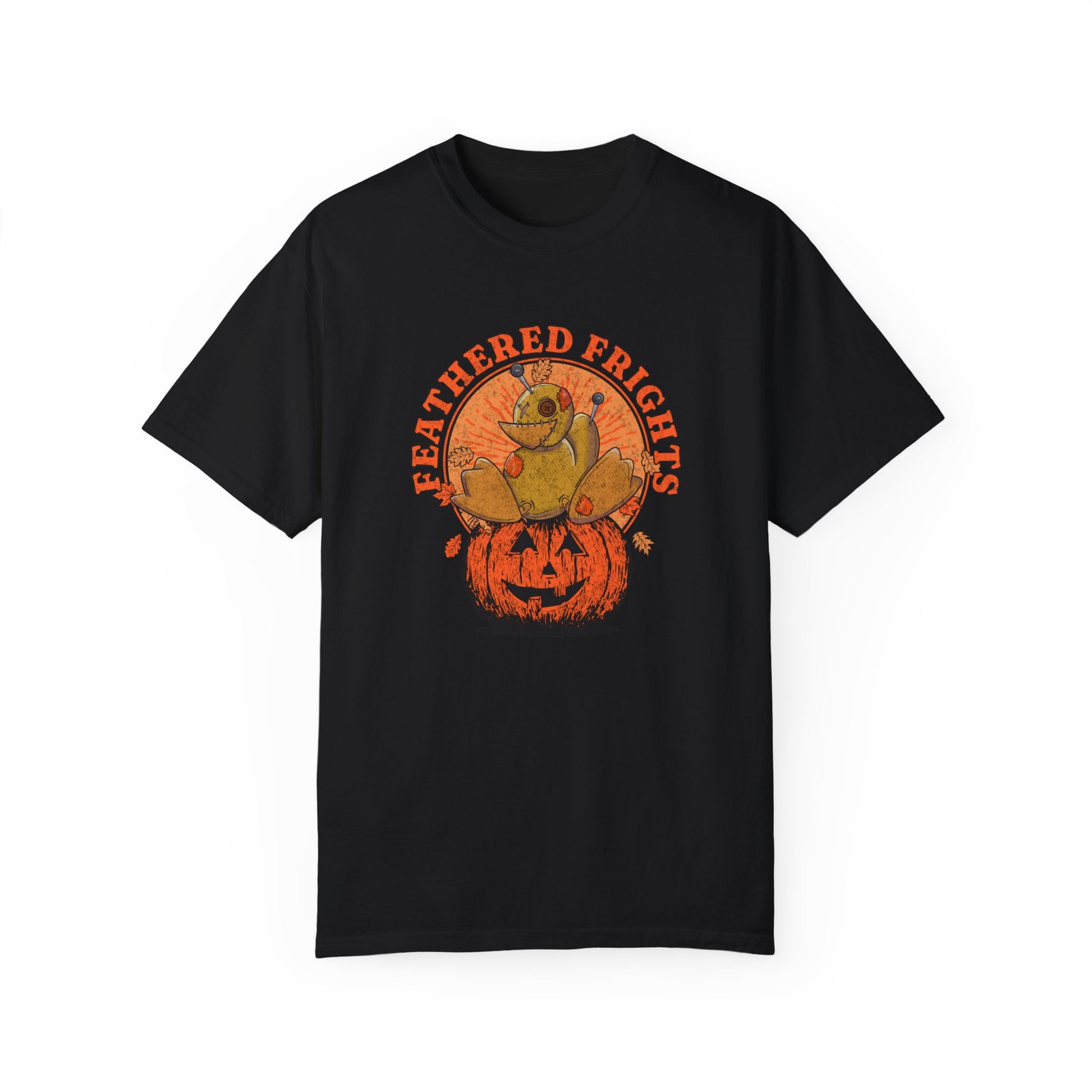 Unleash the spooky side of your wardrobe with our "Feathered Frights" t-shirt! This design features a playful twist on Halloween, showcasing a voodoo-style rubber duck perched atop a grinning jack-o'-lantern. With its stitched details and button eye, this quirky duck is ready to bring some lighthearted chills to your Halloween festivities. Perfect for those who love a mix of fun and fright, this tee is a must-have for the spooky season. Wear it to your next Halloween party or just to show off your love for all things eerie and adorable!