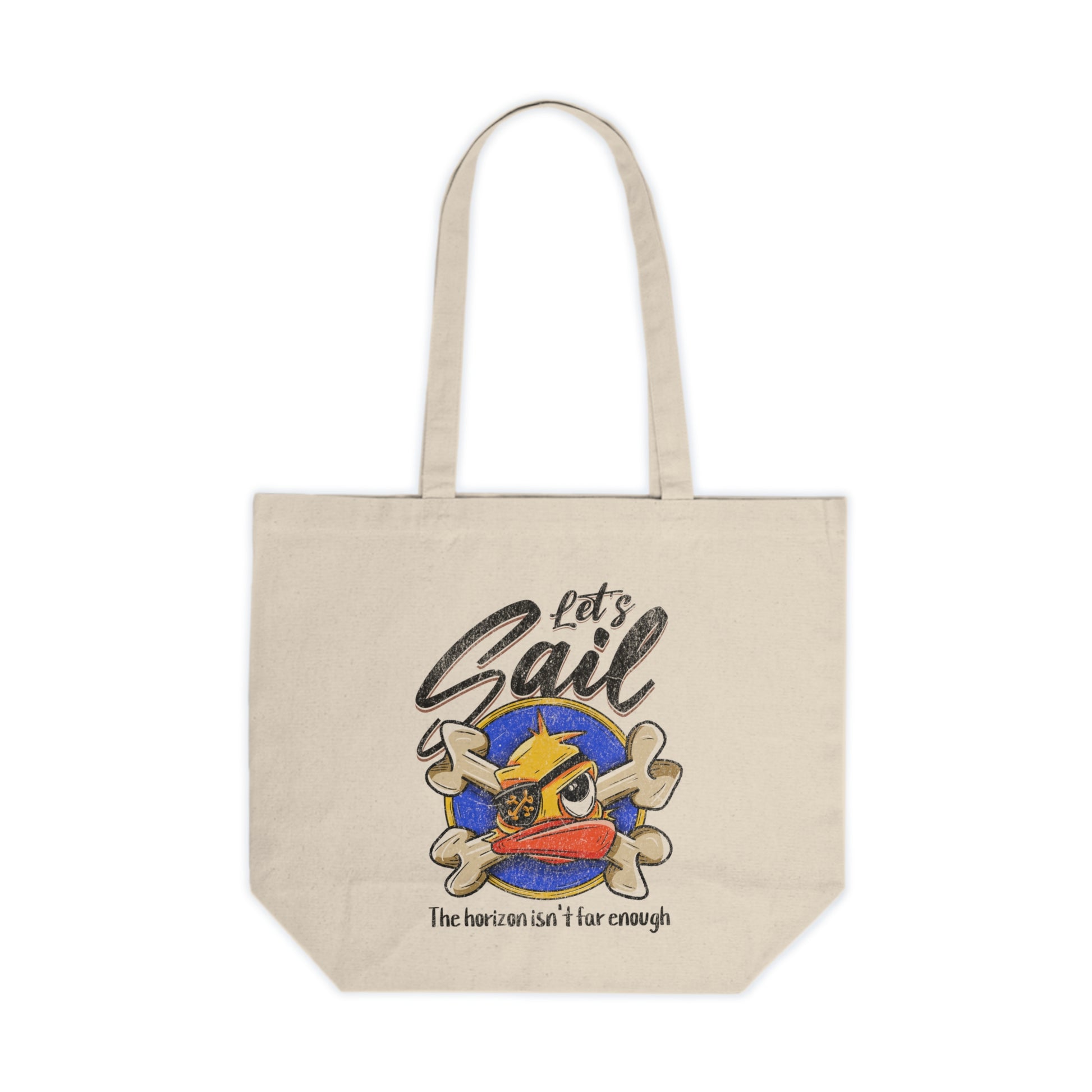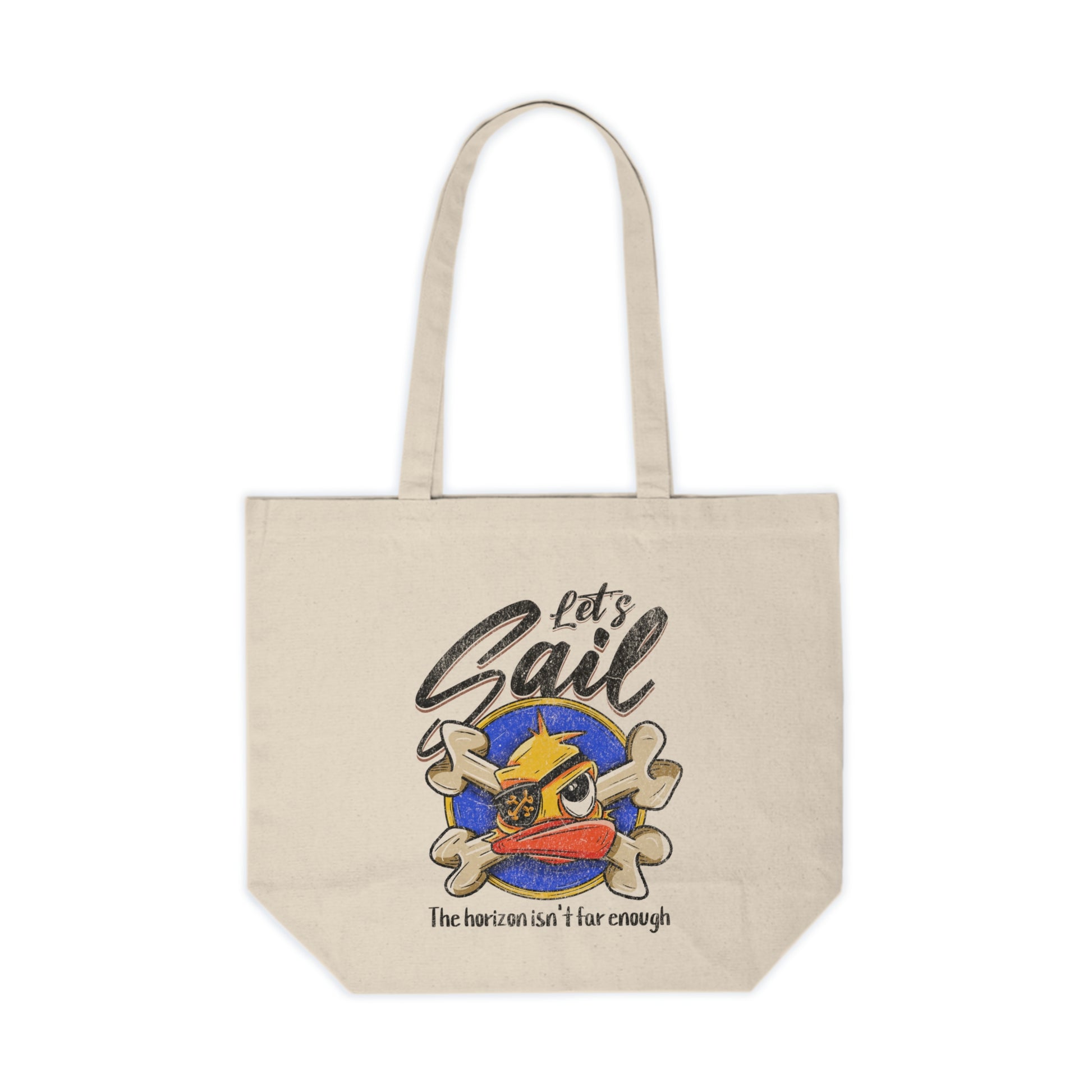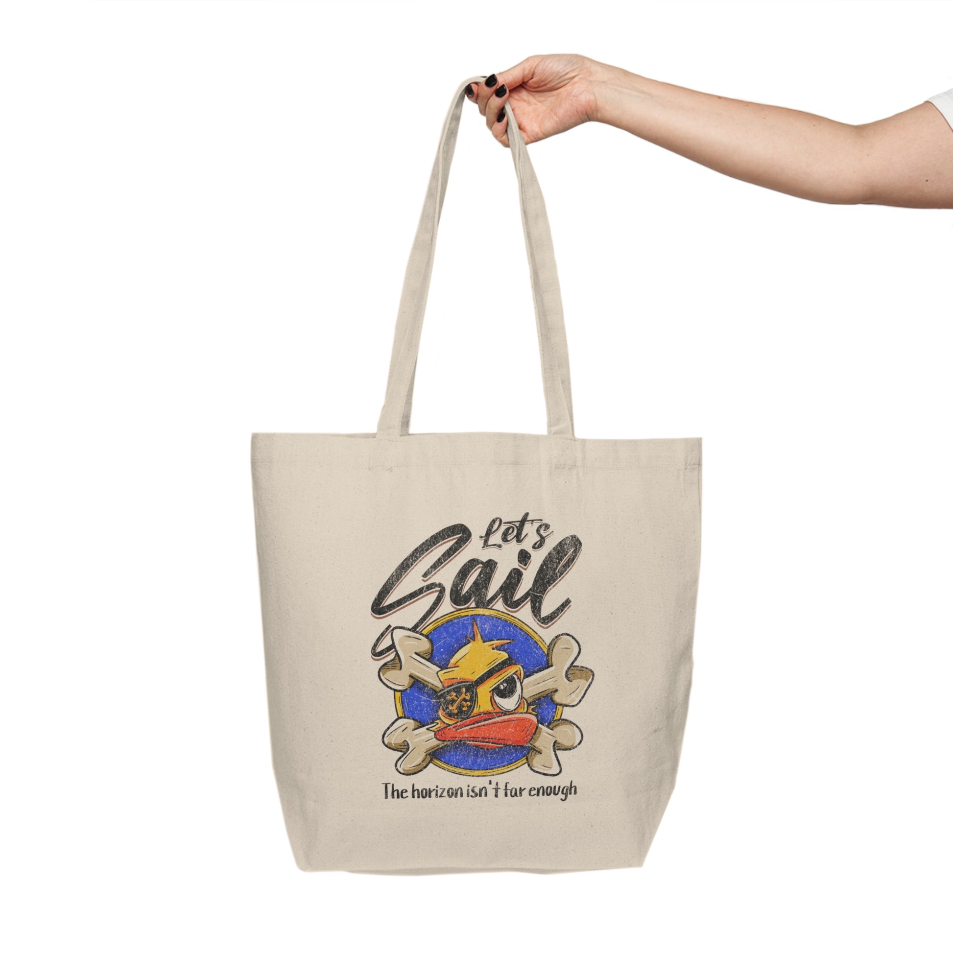 Set sail with style and sustainability with our "Let's Sail" Pirate Duck Natural Canvas Tote! This eco-friendly tote bag features a bold and playful design of a pirate-inspired rubber duck, complete with an eyepatch, pirate hat, and crossed bones. The catchy slogan "The horizon isn't far enough" perfectly captures the adventurous spirit and adds a whimsical touch to your daily errands.