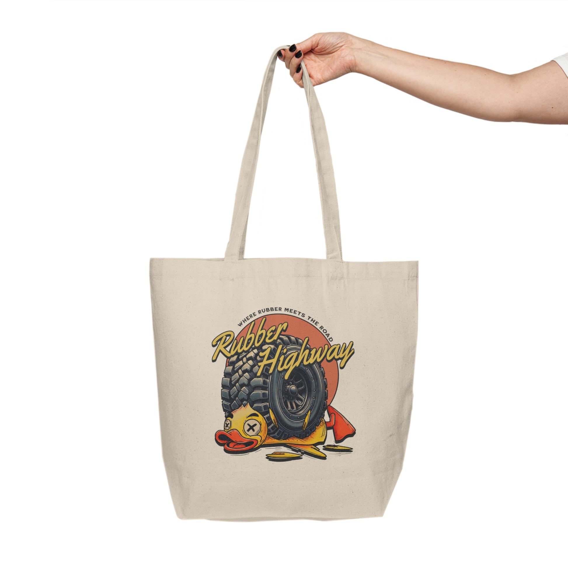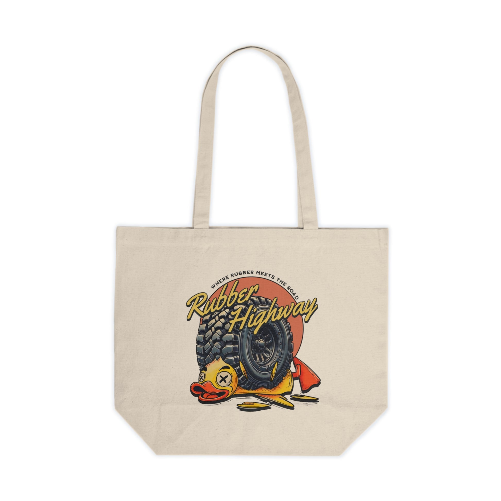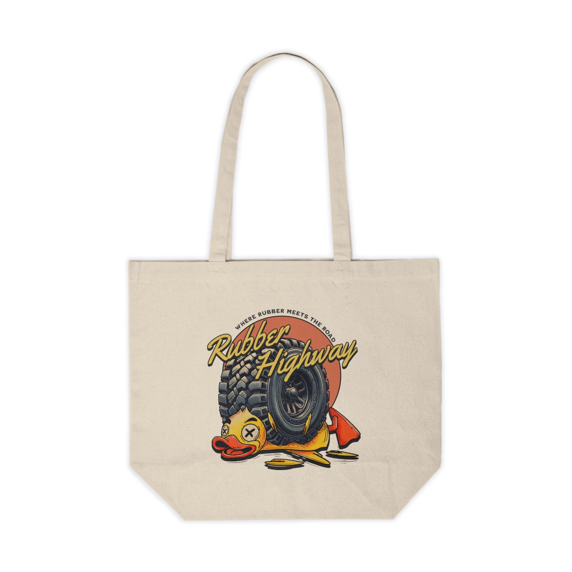 Carry your essentials in style with the Rubber Highway Canvas Tote! Perfect for off-road enthusiasts who like to keep it practical and fun, this tote features the iconic design of a flattened rubber duck under the tread of a 4x4 tire, making it a unique accessory that’s sure to catch eyes wherever you go.