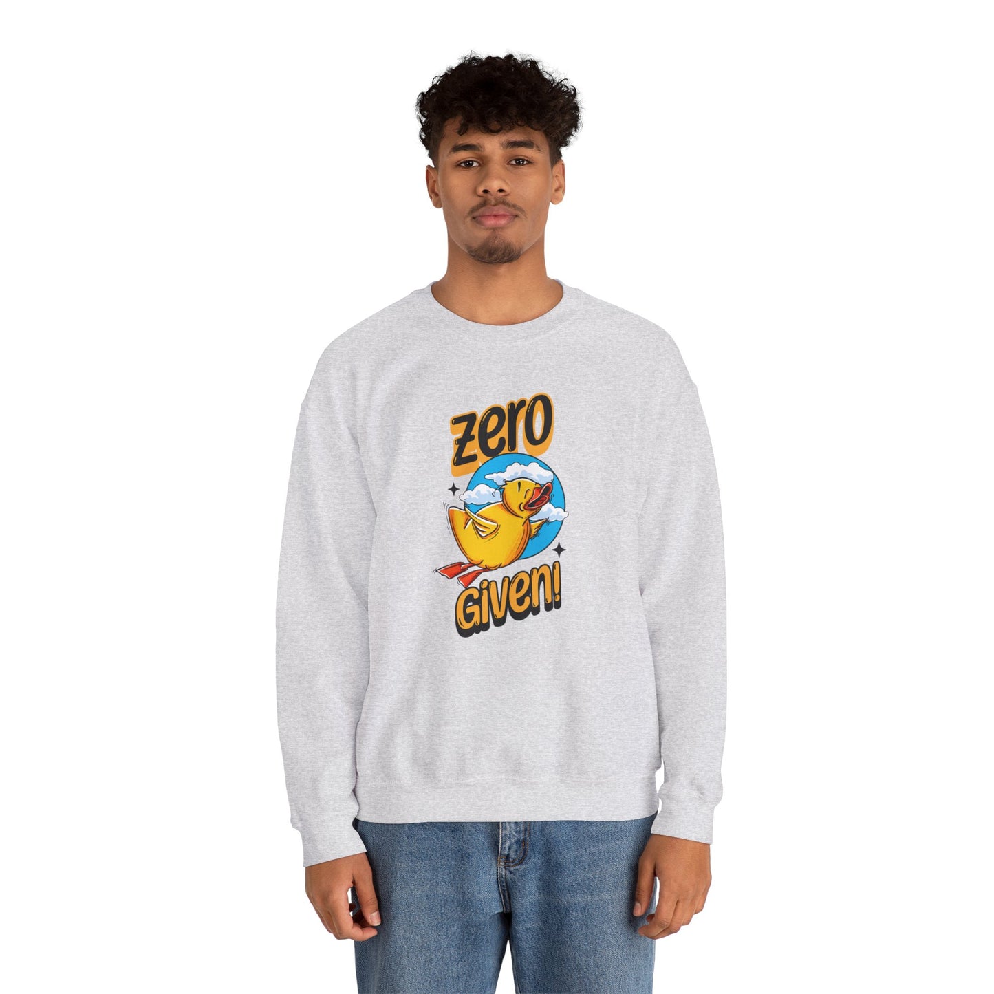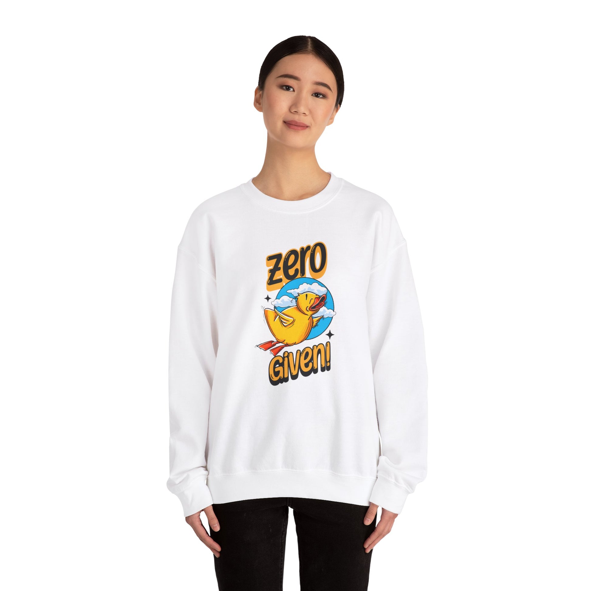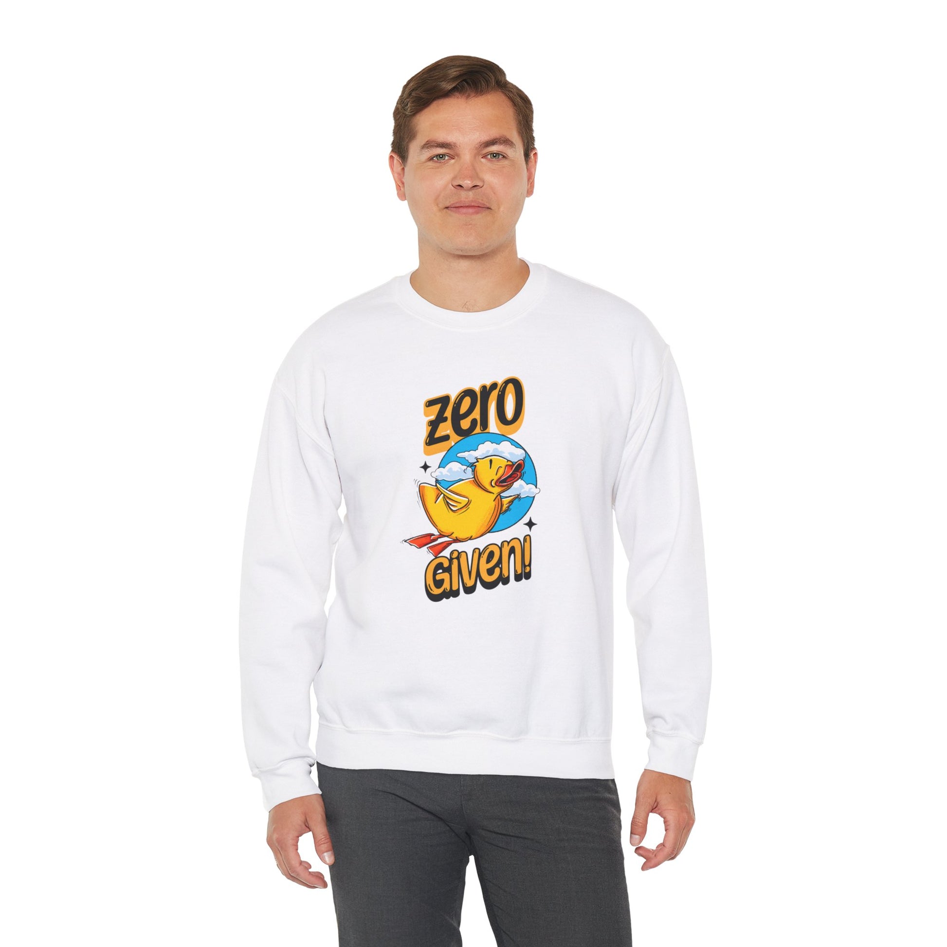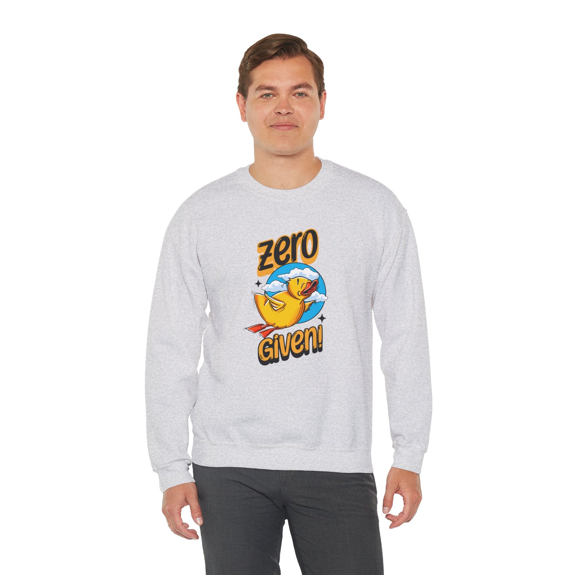 Embrace your carefree spirit with this cozy "Zero Given" crewneck sweatshirt, featuring a spunky rubber duck that doesn’t give a quack! Perfect for those chill days when you want to stay warm and let your attitude fly, this sweatshirt combines humor and style with a vibrant design. The bold rubber duck, soaring through a sky of fluffy clouds, captures that perfect blend of playfulness and defiance.
