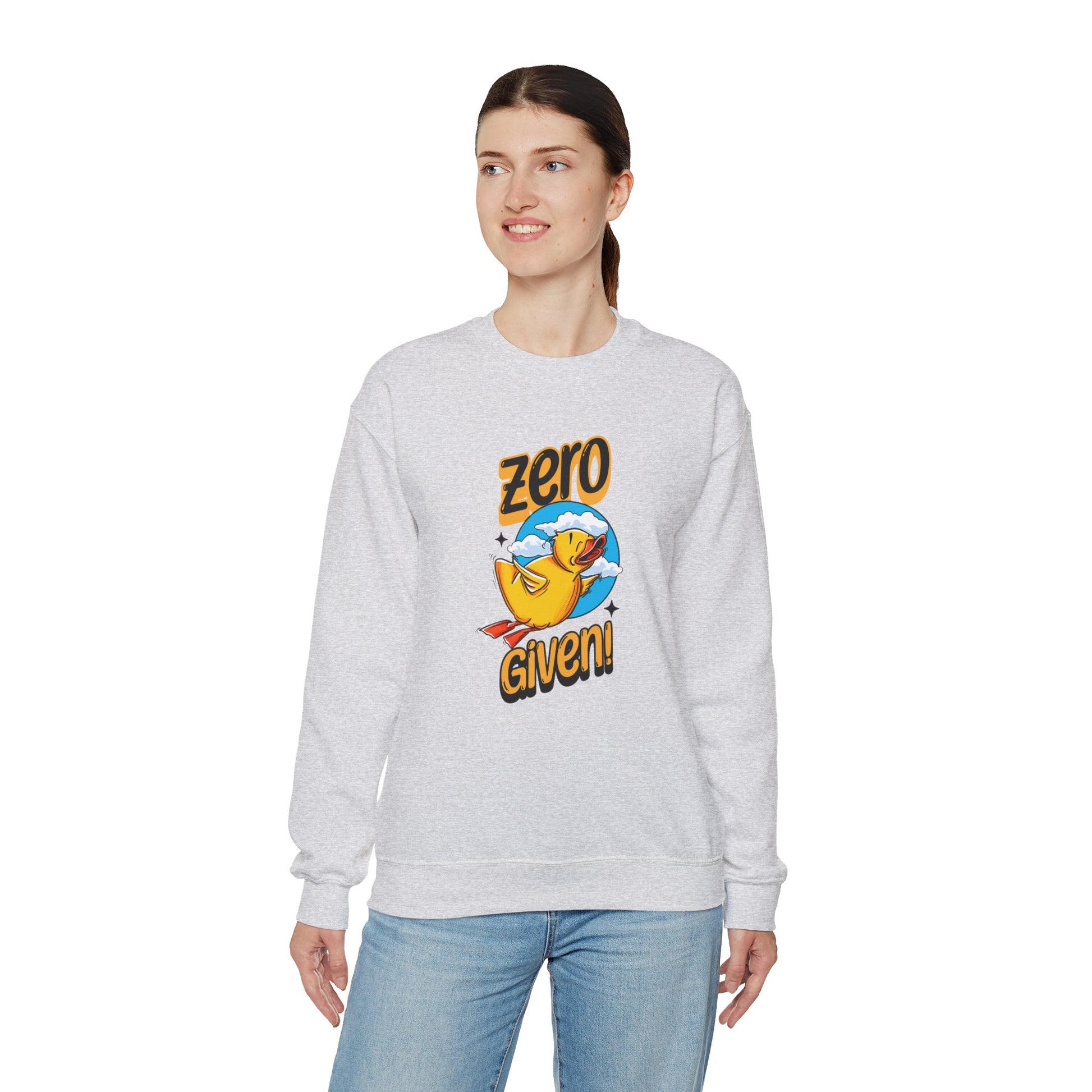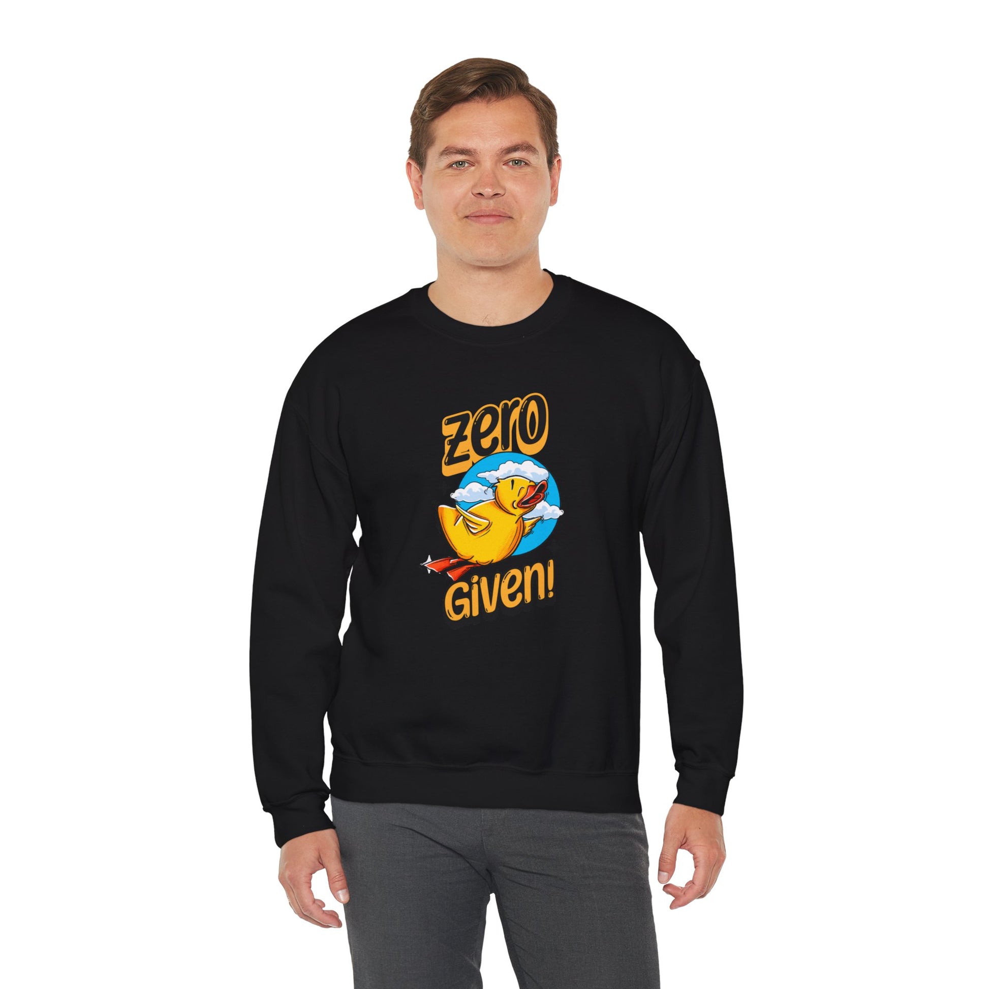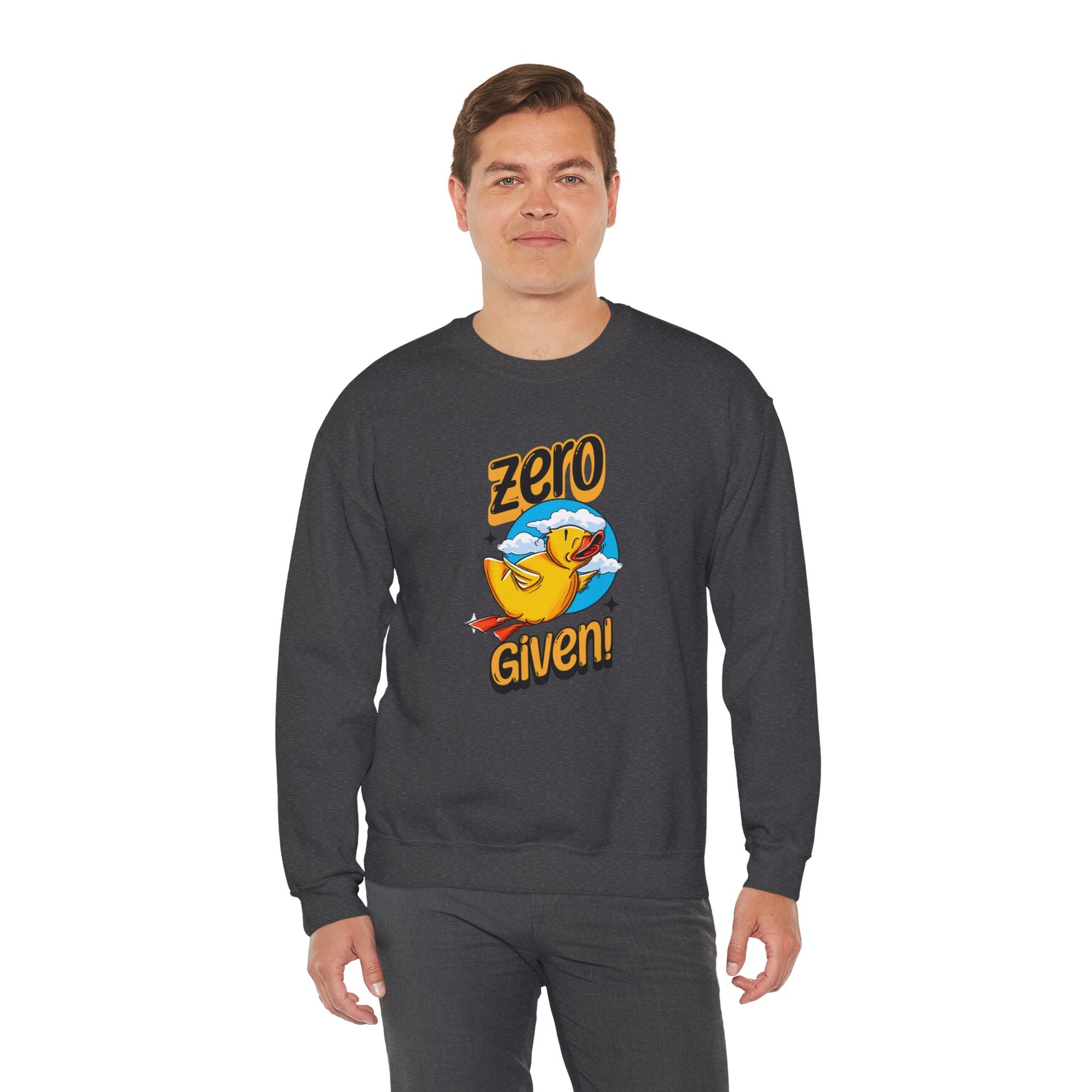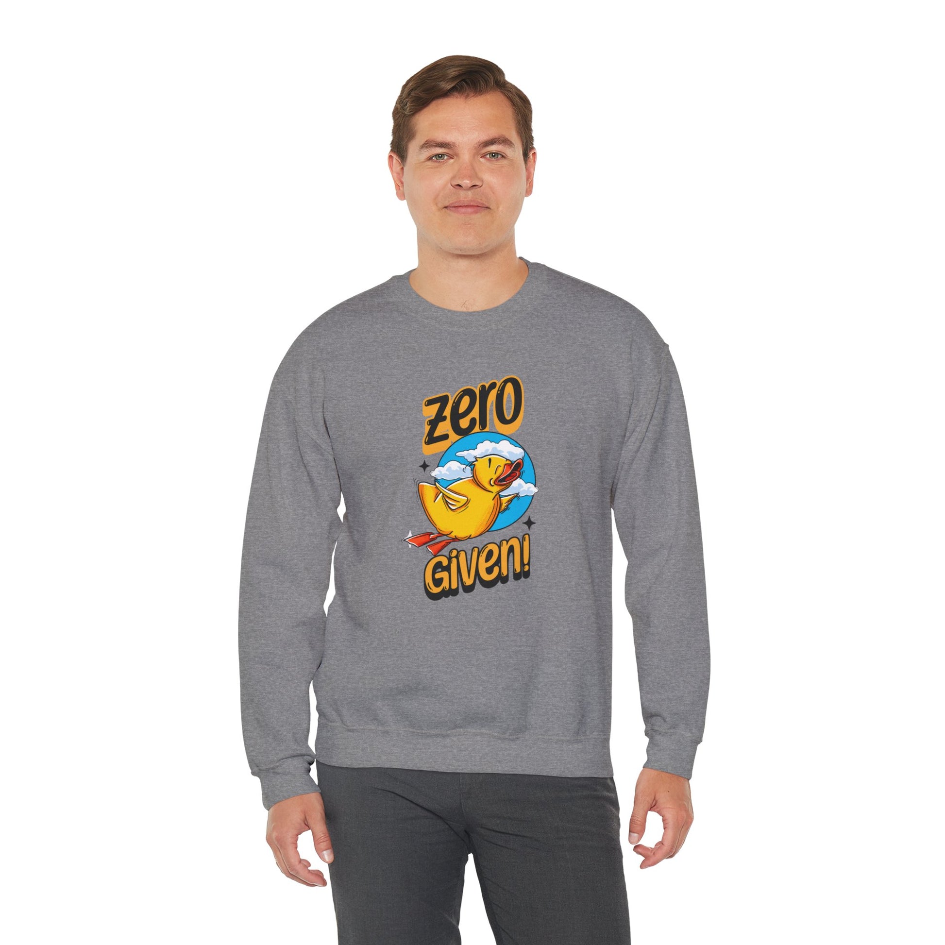 Embrace your carefree spirit with this cozy "Zero Given" crewneck sweatshirt, featuring a spunky rubber duck that doesn’t give a quack! Perfect for those chill days when you want to stay warm and let your attitude fly, this sweatshirt combines humor and style with a vibrant design. The bold rubber duck, soaring through a sky of fluffy clouds, captures that perfect blend of playfulness and defiance.