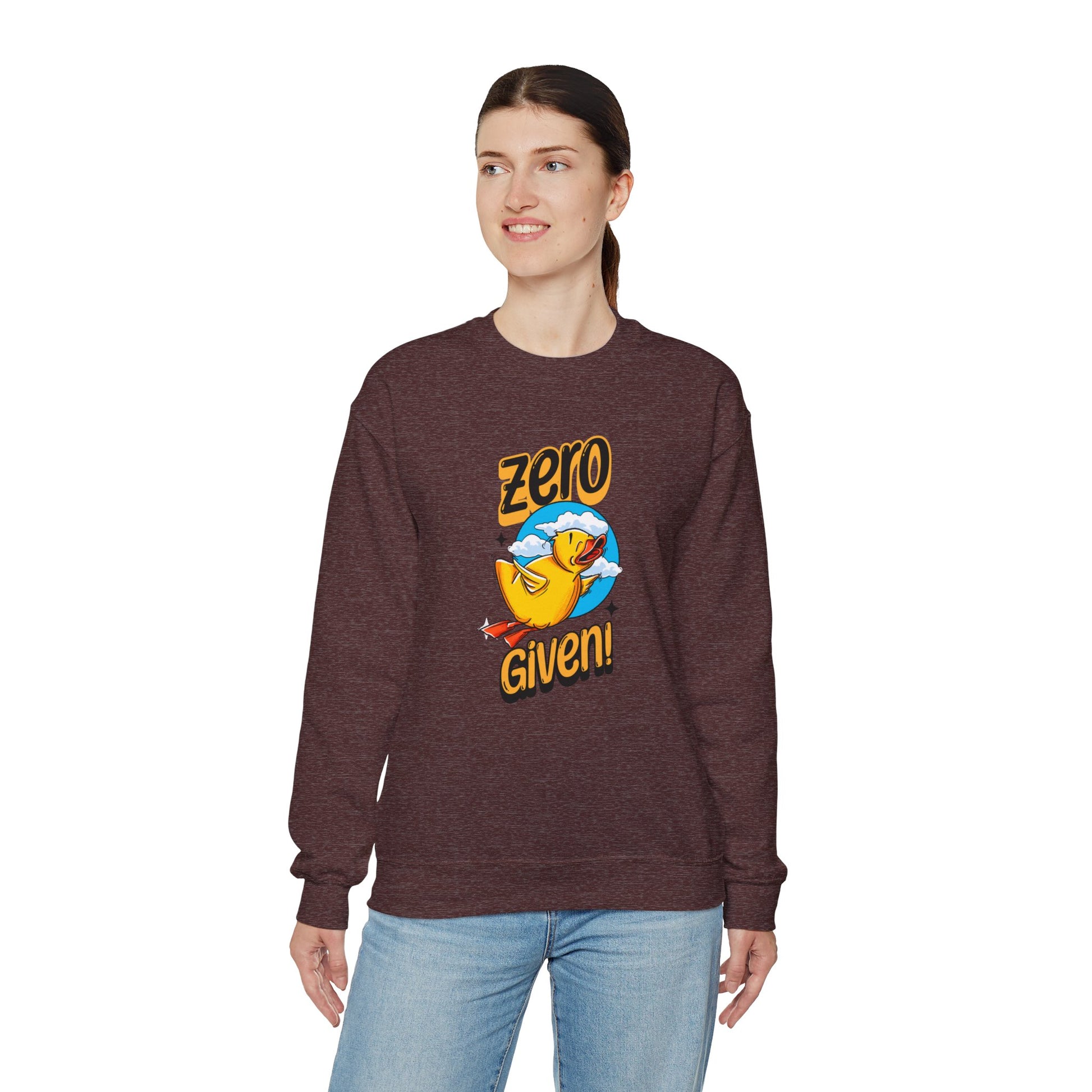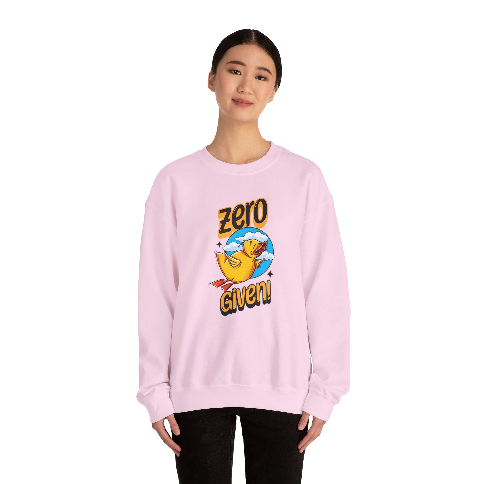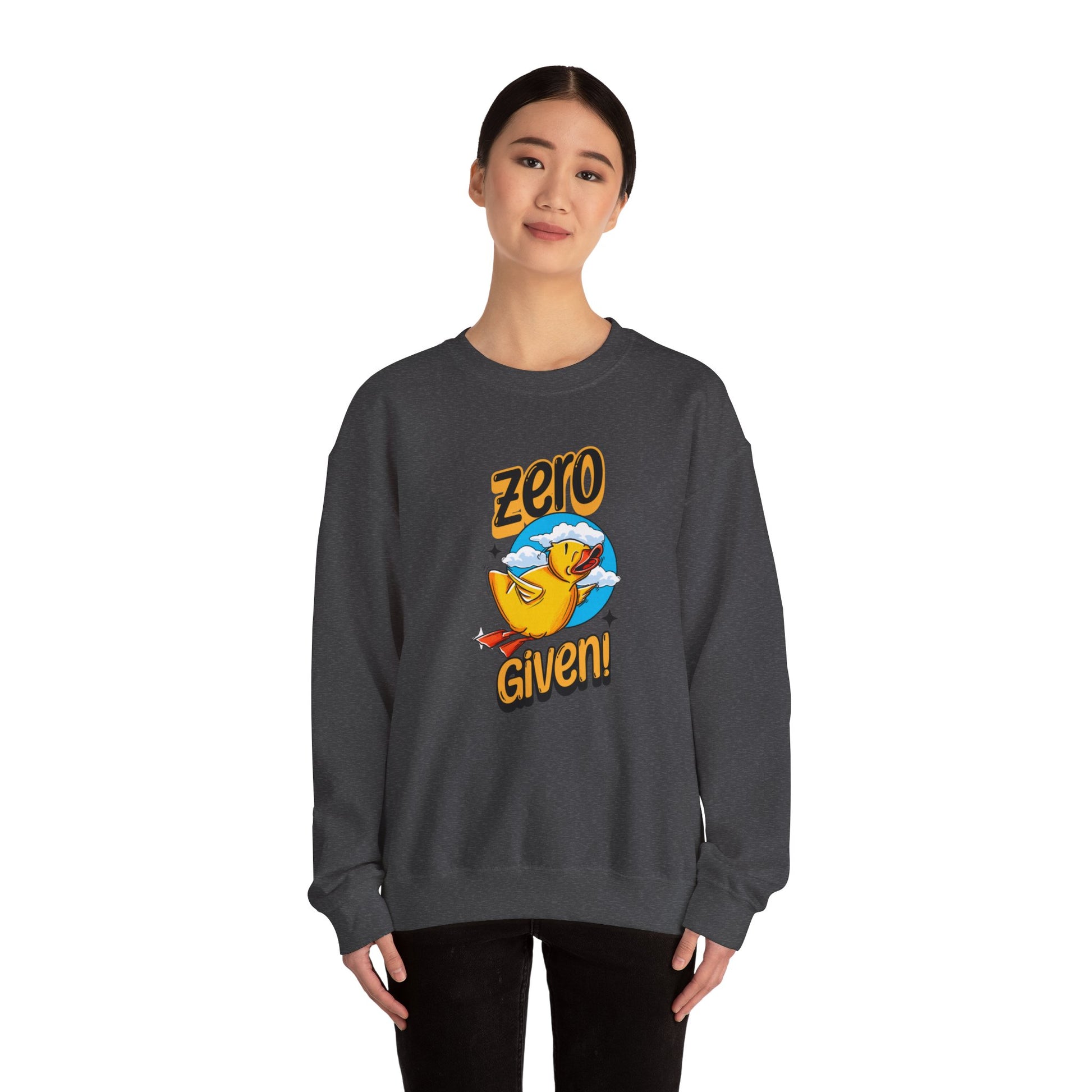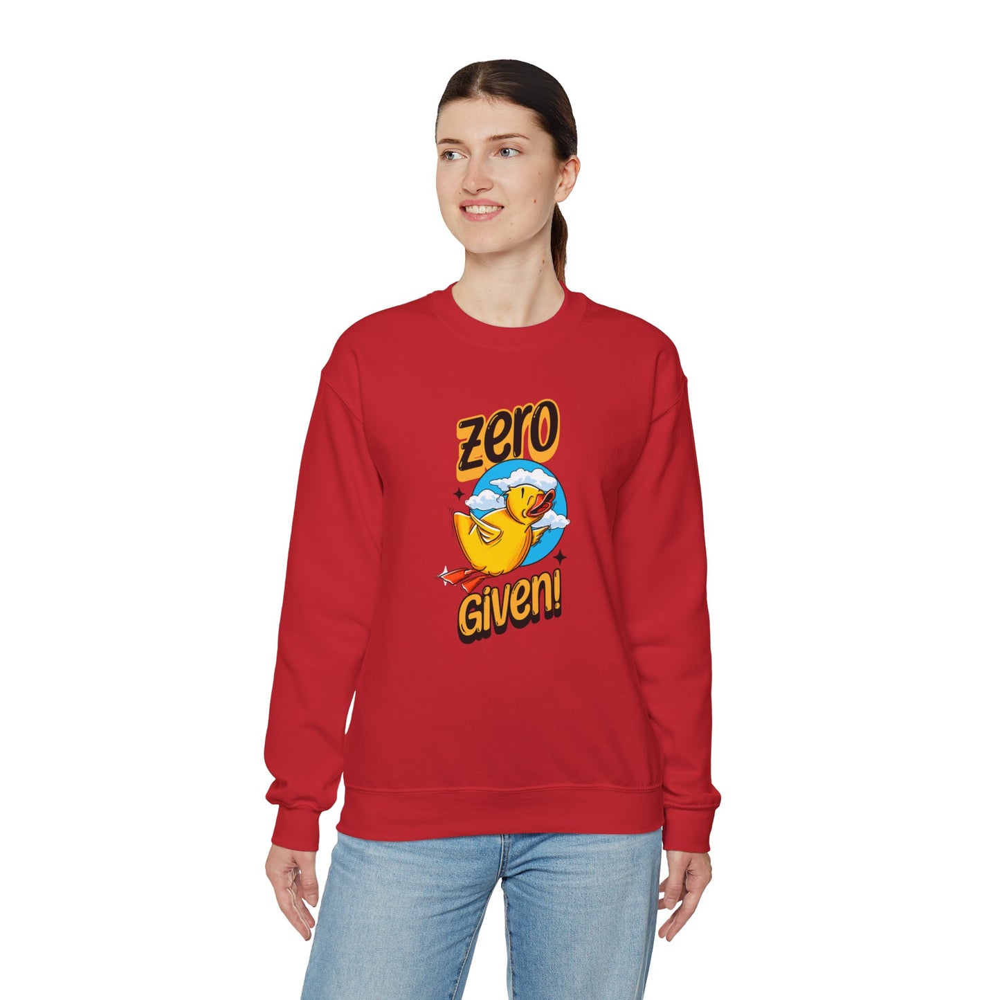 Embrace your carefree spirit with this cozy "Zero Given" crewneck sweatshirt, featuring a spunky rubber duck that doesn’t give a quack! Perfect for those chill days when you want to stay warm and let your attitude fly, this sweatshirt combines humor and style with a vibrant design. The bold rubber duck, soaring through a sky of fluffy clouds, captures that perfect blend of playfulness and defiance.