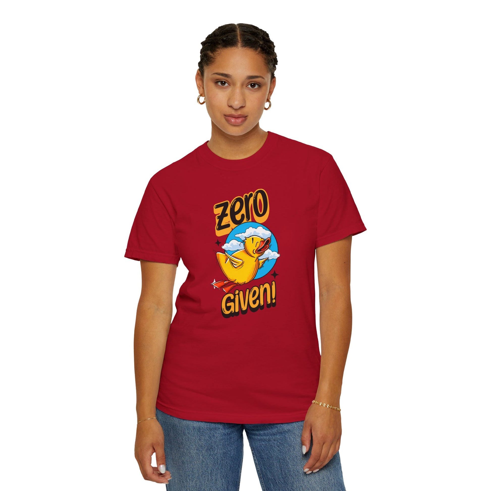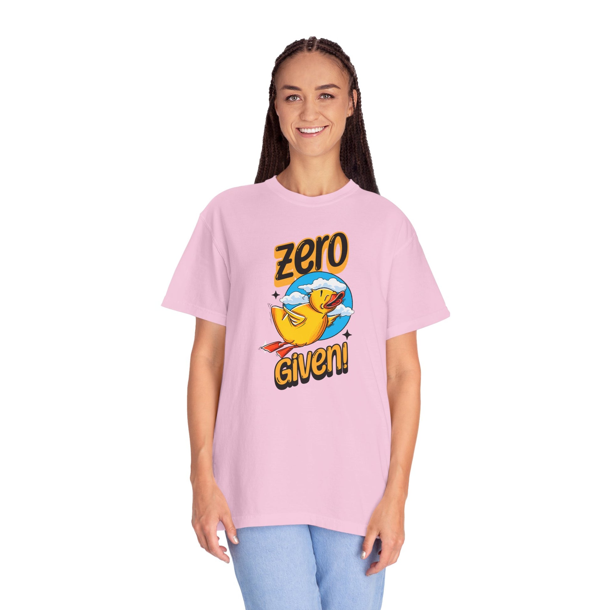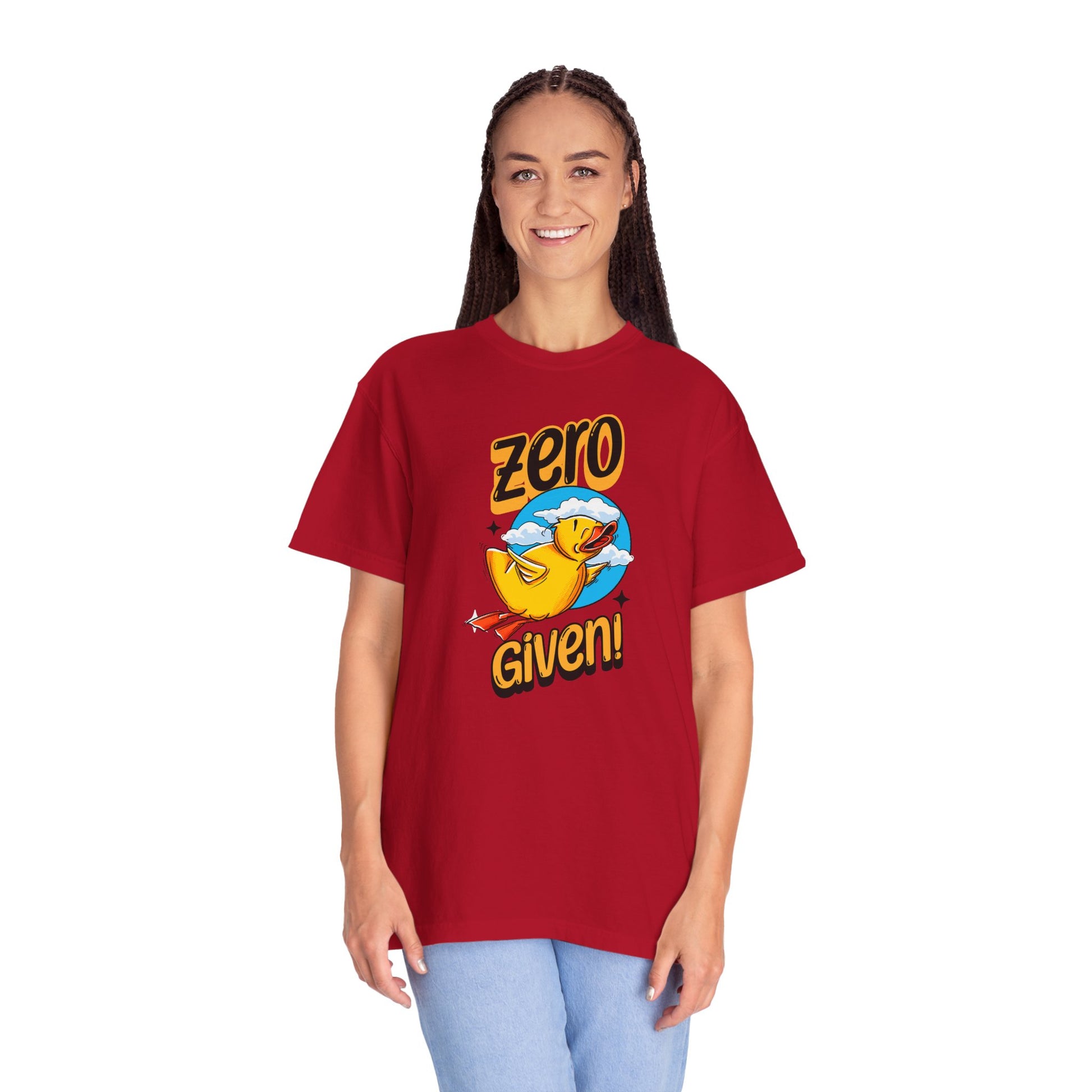 Make a bold statement with this cheeky "Zero Given" t-shirt featuring a fearless rubber duck soaring through the sky! Perfect for those days when you just don't give a quack, this shirt combines playful art with a carefree attitude. The vibrant design showcases a determined rubber duck flapping its wings with a devil-may-care expression, set against a backdrop of fluffy clouds.