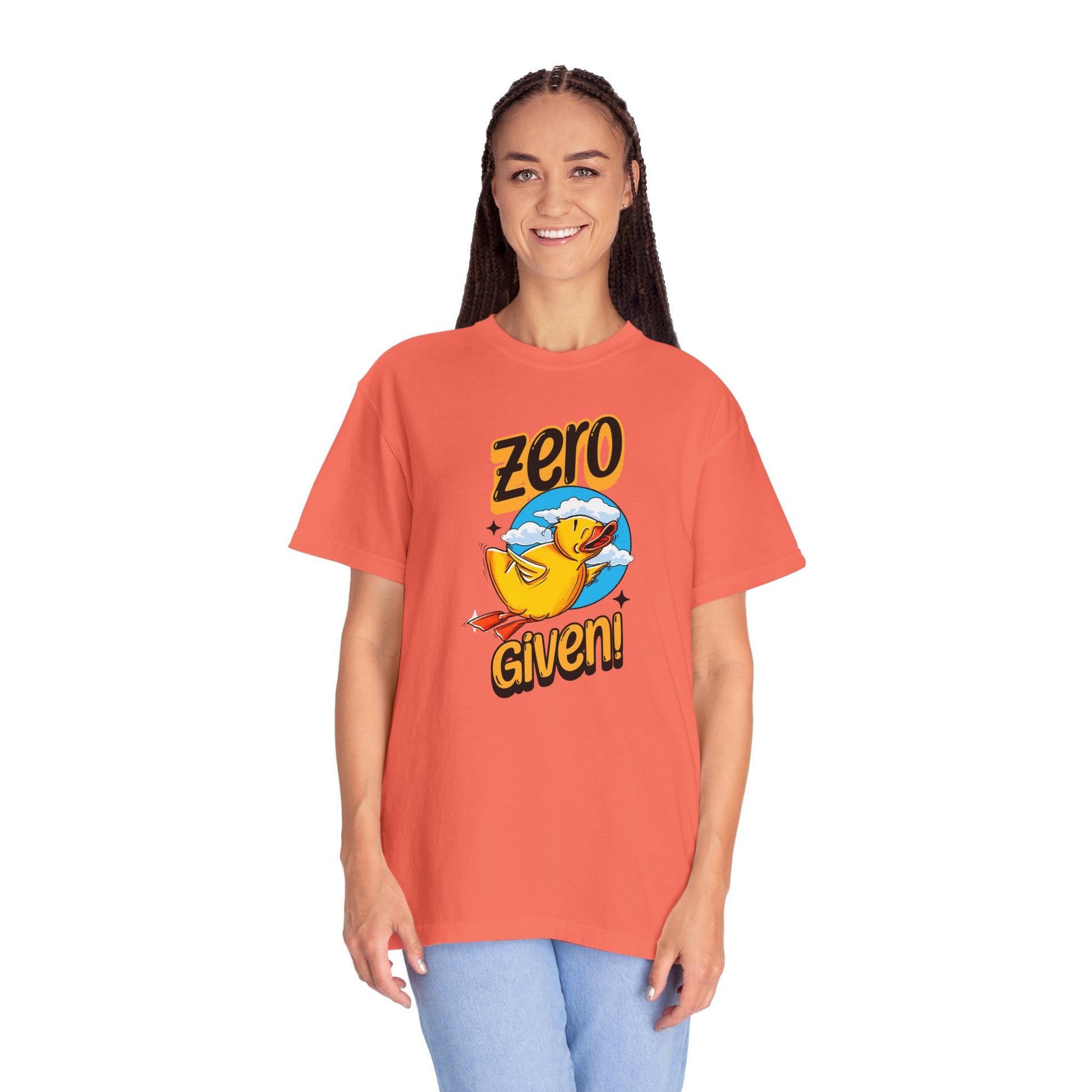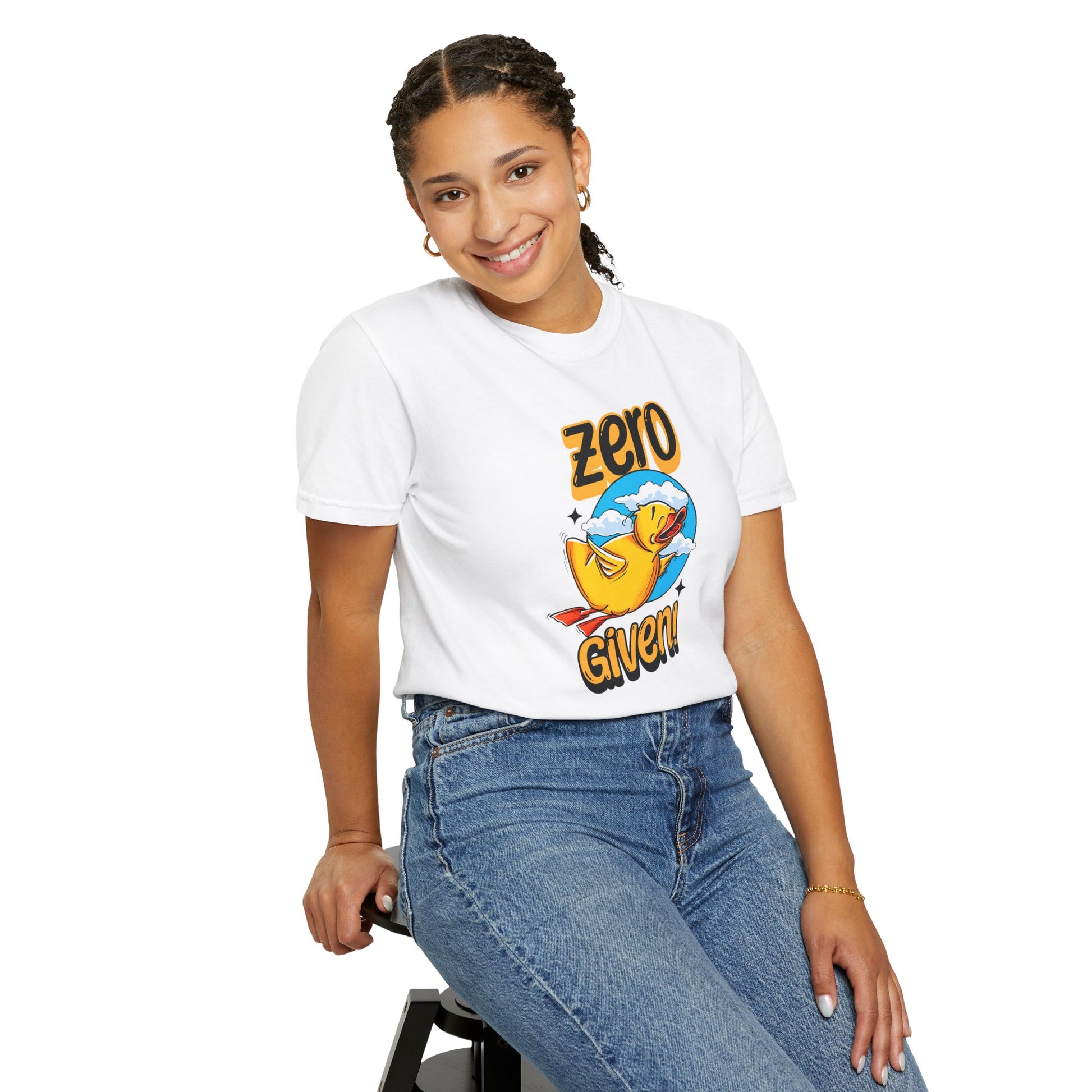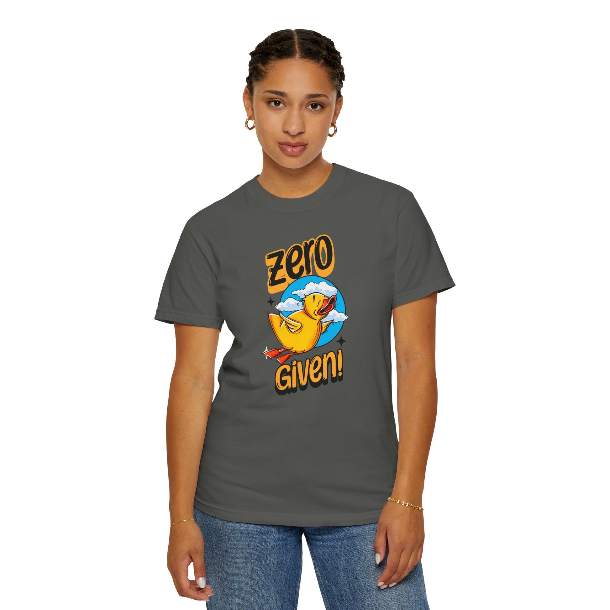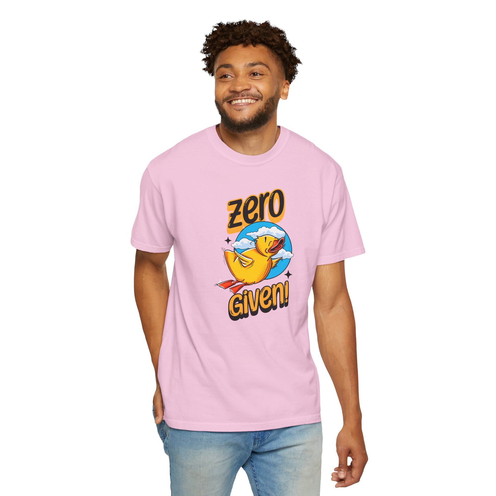 Make a bold statement with this cheeky "Zero Given" t-shirt featuring a fearless rubber duck soaring through the sky! Perfect for those days when you just don't give a quack, this shirt combines playful art with a carefree attitude. The vibrant design showcases a determined rubber duck flapping its wings with a devil-may-care expression, set against a backdrop of fluffy clouds.